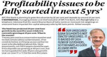IDFC First Bank has announced the next phase of growth parameters in which the lender is planning to grow the advances by 20 per cent and deposits by around 25 per cent.