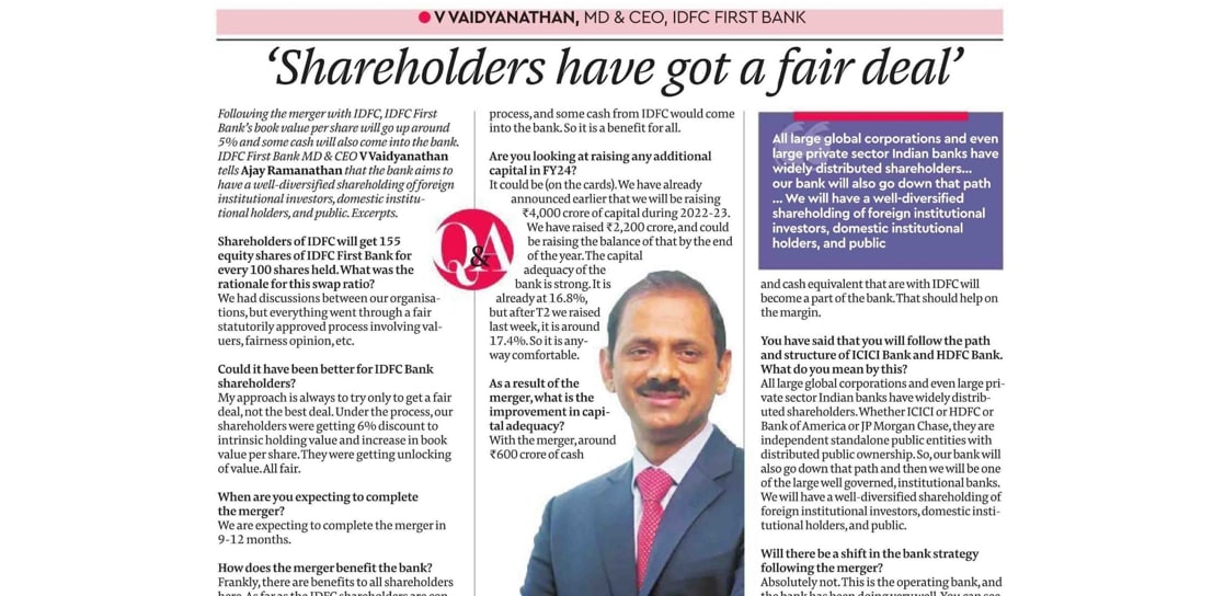 IDFC FIRST Bank’s MD & CEO, Mr. V. Vaidyanathan says, “In terms of strategy, we need to grow at a steady pace. Our focus is to stay on the pitch for long, not hit sixes and fours.”