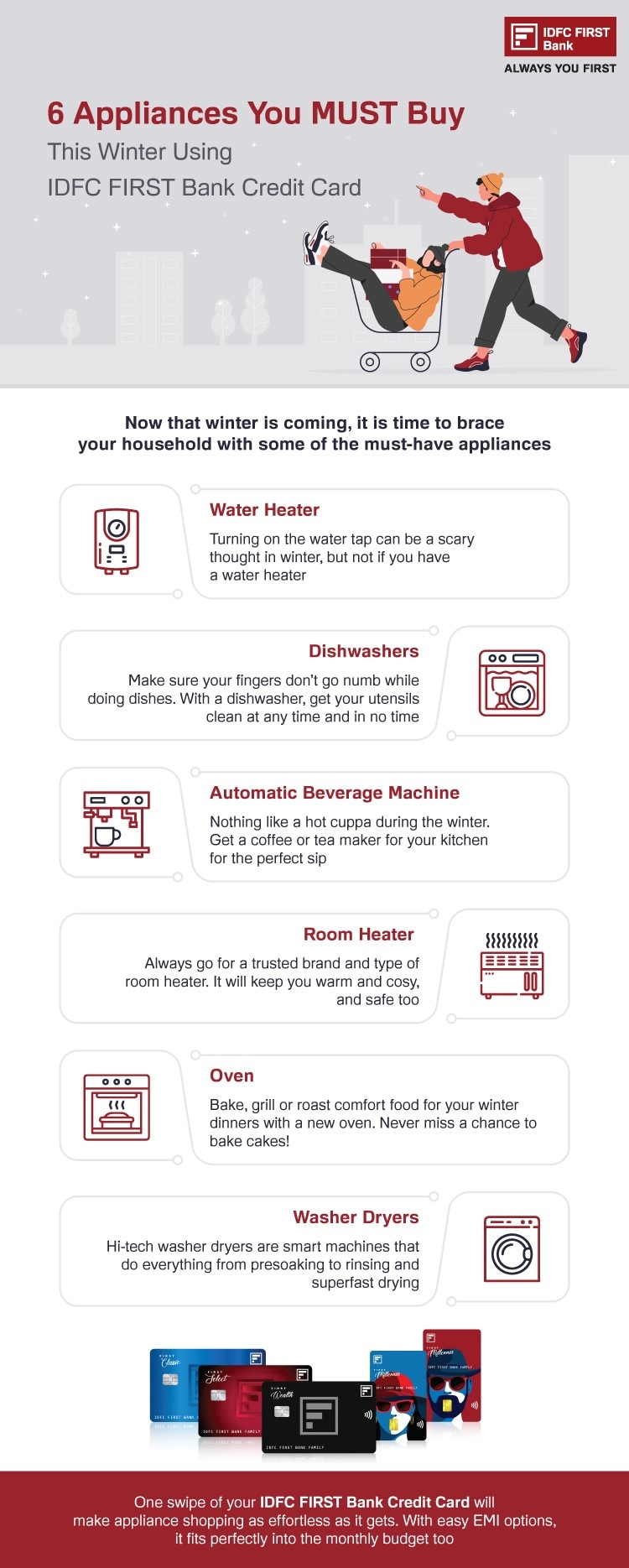 Summary: Winter calls for home appliances like water heater, dishwashers, room heater, etc., that can be bought with easy EMI using your IDFC FIRST Bank Credit Card.