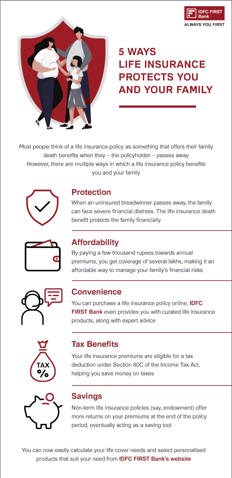 Summary: There are multiple ways in which Life Insurance protects you and your family such as paying off debt, availing tax benefits etc., Learn more about Life Insurance in this infographic.